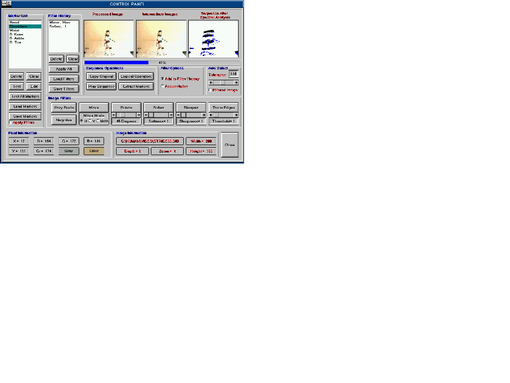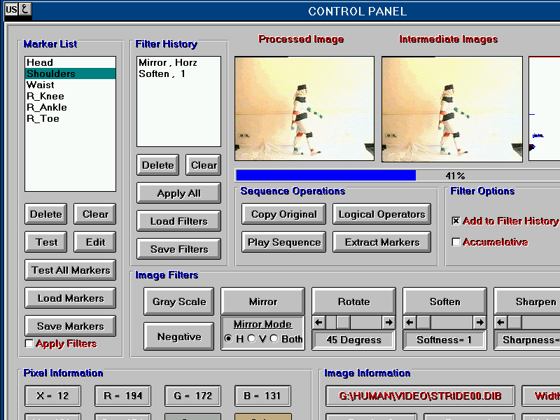 Copies of the executables, body contours, and walking traces for the Marker Tracker program and the Walker program are available for instructionl purposes upon request.